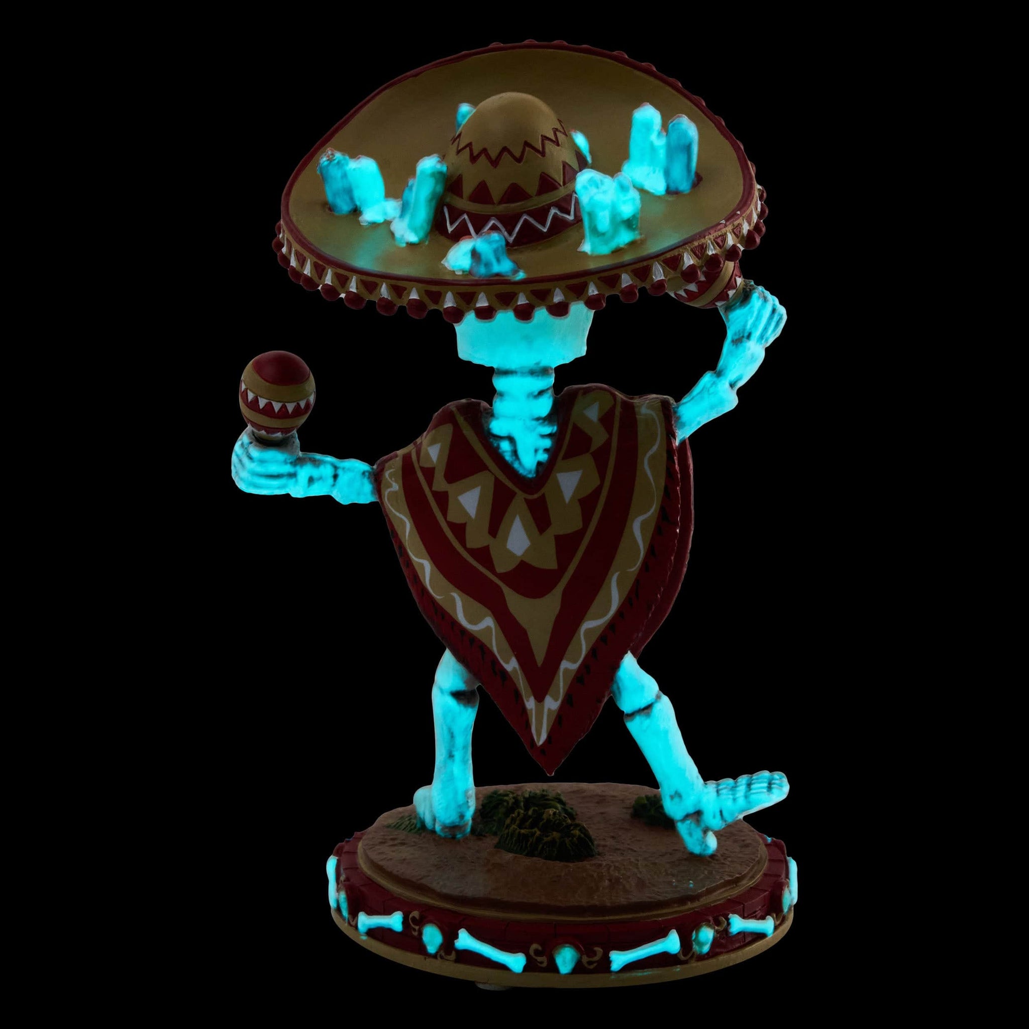 - Portrays skeleton with calavera skull wearing sombrero and poncho and holding maracas, ready to get the party started