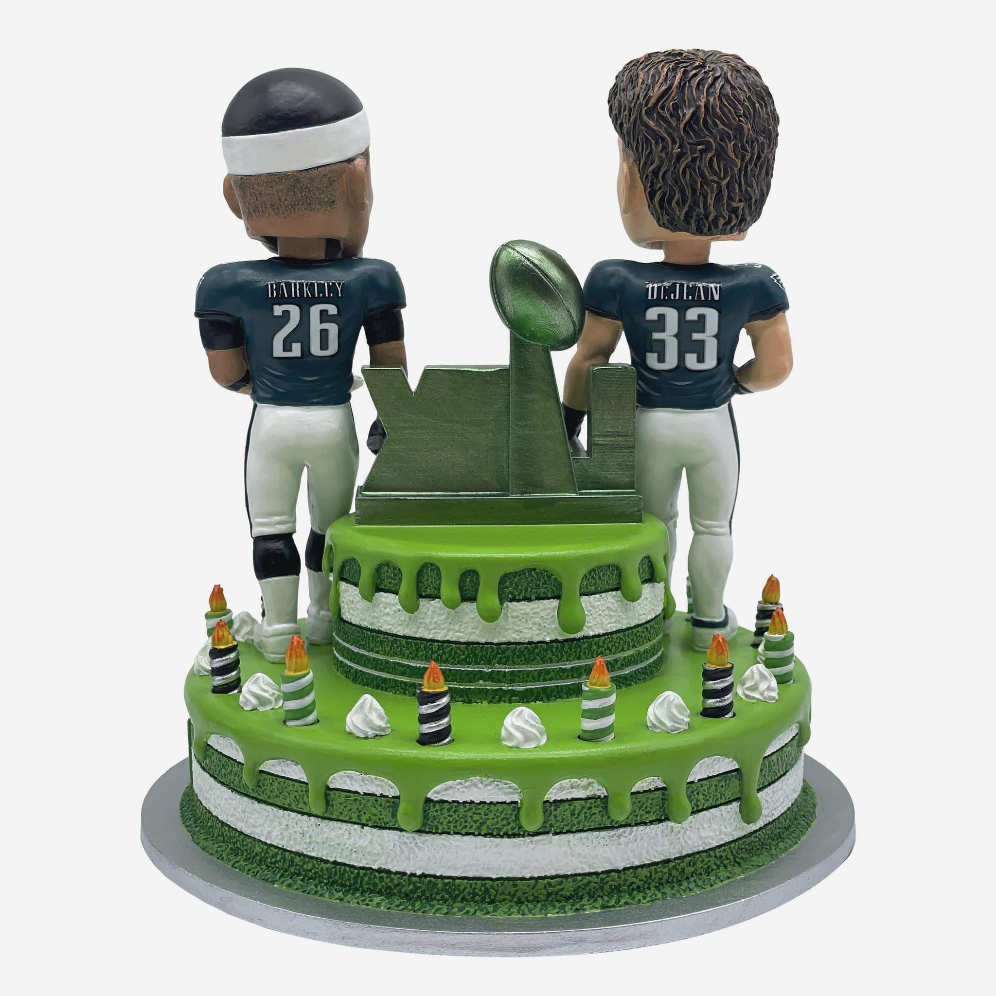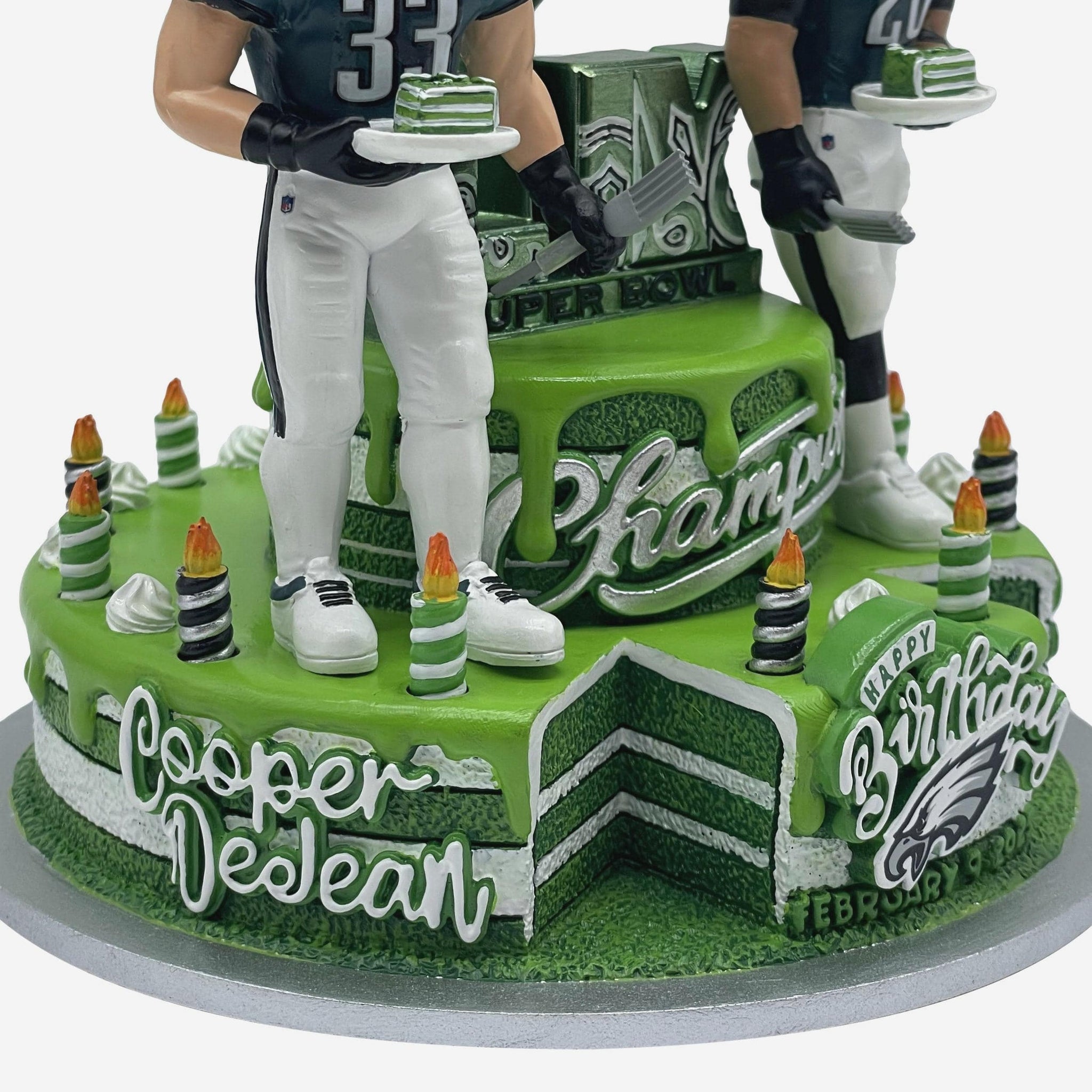 • Portrays DeJean and Barkley wearing their green gameday uniforms and holding cake, ready to have a Super Bowl Champions birthday bash