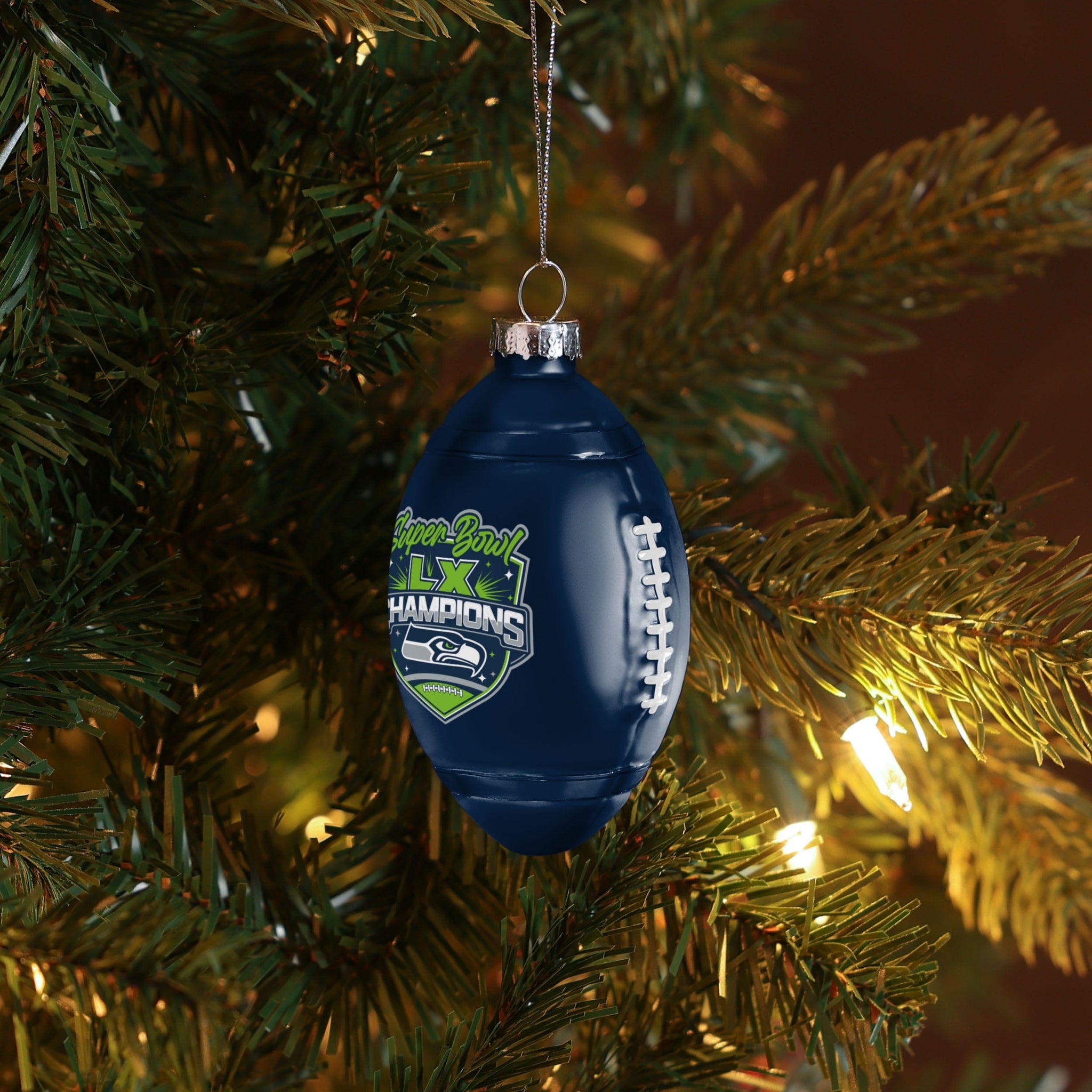 They say to keep your eye on the ball. We're making that "Super" easy with this Seattle Seahawks Super Bowl LX Champions Blown Glass Football Ornament.