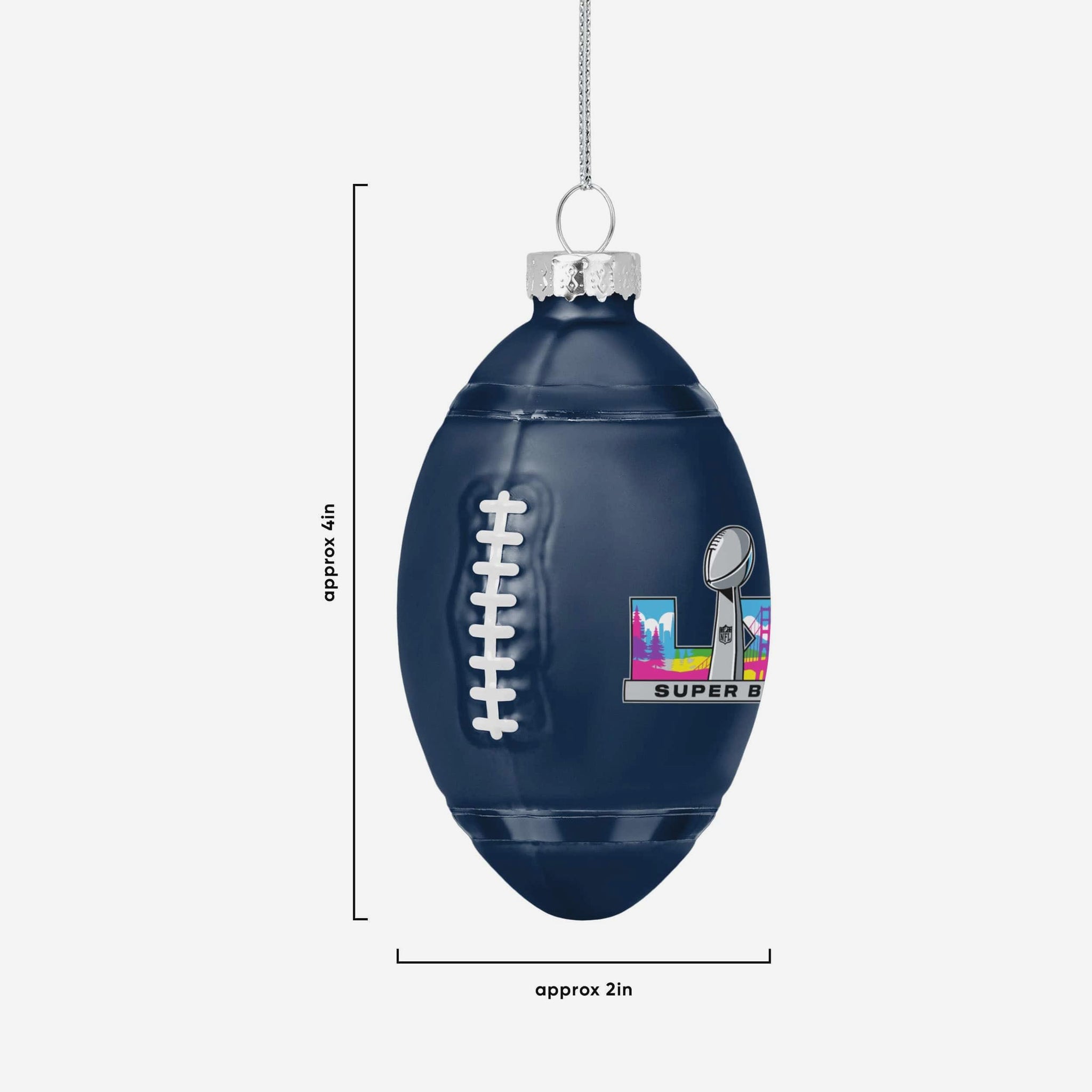 - Team-colored blown glass football ornament with championship logo displays, in case there were any doubts where your allegiances lie