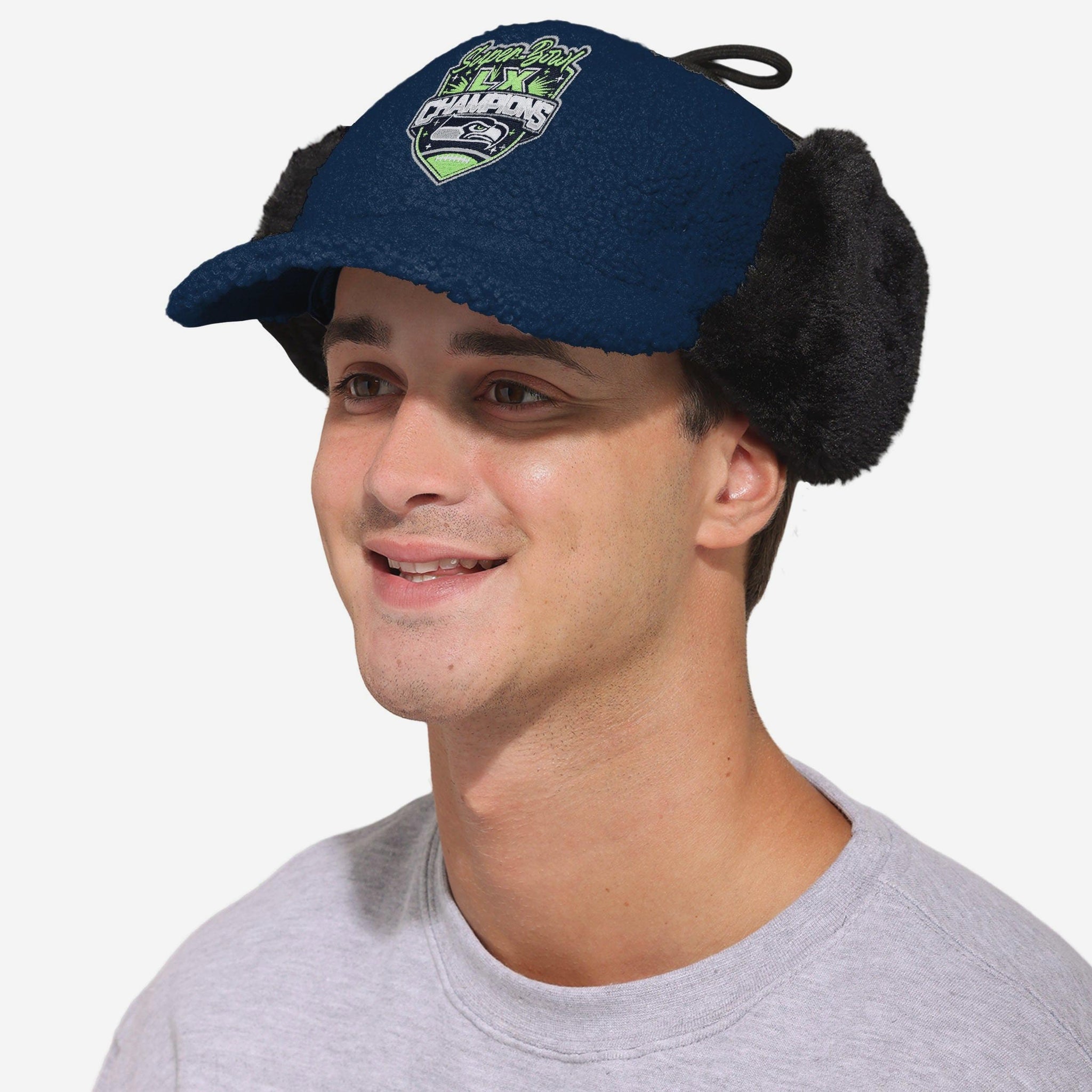 Champs, meet cozy. Meet your new winter MVP: The Seattle Seahawks Super Bowl LX Champions Sherpa Trapper Cap. Designed with a six-panel build and deep-curve visor, it’s a classic ballcap look with a game-changing sherpa twist. Stay warm, stay loud, and stay legendary.