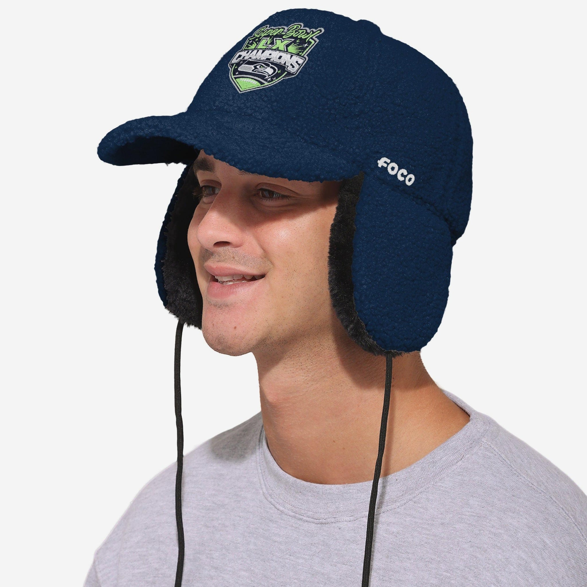 Seattle Seahawks Super Bowl LX Champions Sherpa Trapper Cap FOCO - FOCO.com