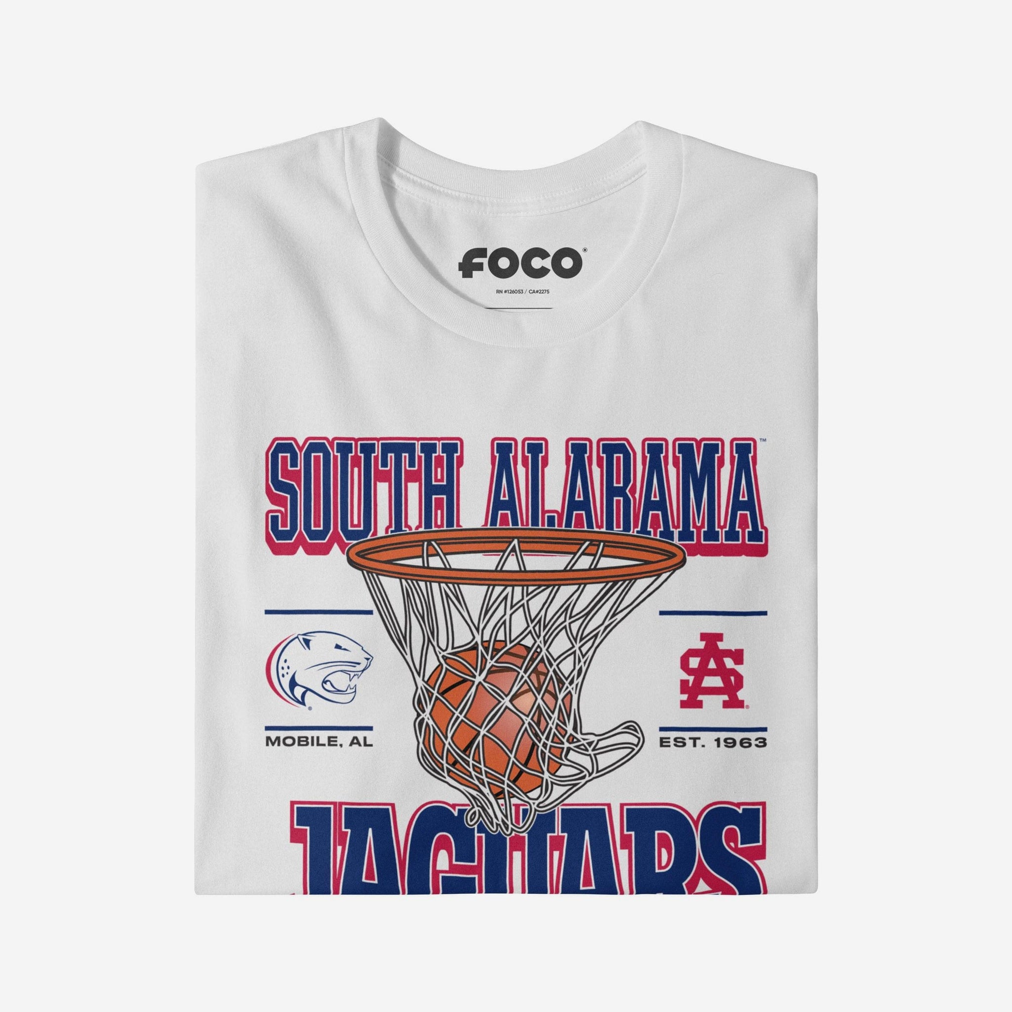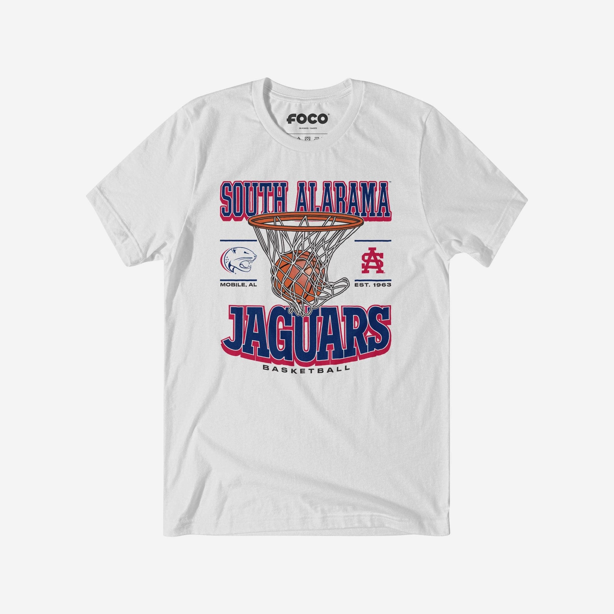 This top features a design that showcases your all-important team colors, a team logo display, a team wordmark name display, year of team establishment, and a basketball swishing through a net display meaning this t-shirt will prove your unmatched dedication to the South Alabama Jaguars when you're at the game or watching at home. In other words, this graphic tee is about to be your new favorite teammate.