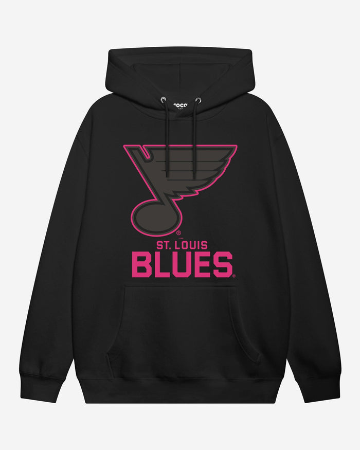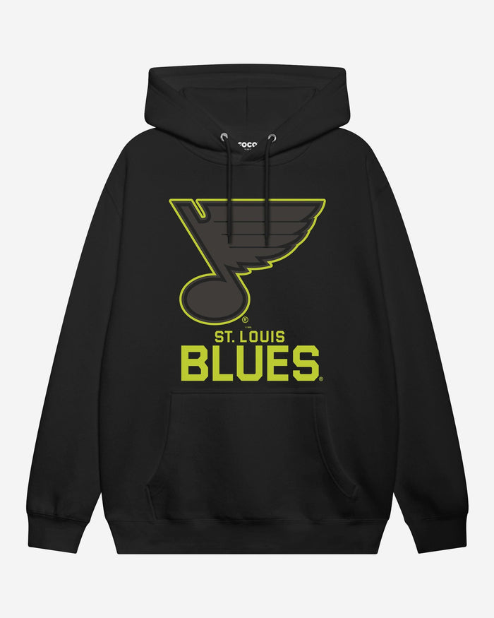 - Team logo display with highlight outline: The front of this apparel features a black St Louis Blues team logo display outlined in neon, and a neon team name display