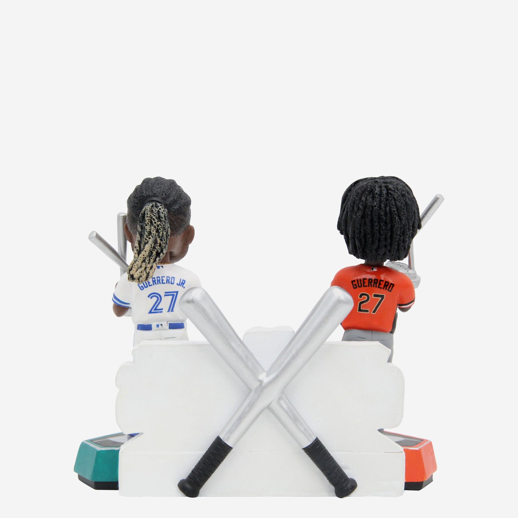 Like father, like son. Prove that superb slugging runs in the family with the Vladimir Guerrero Sr. & Vladimir Guerrero Jr. Los Angeles Angels & Toronto Blue Jays Home Run Derby Champions Then and Now Bobblehead.