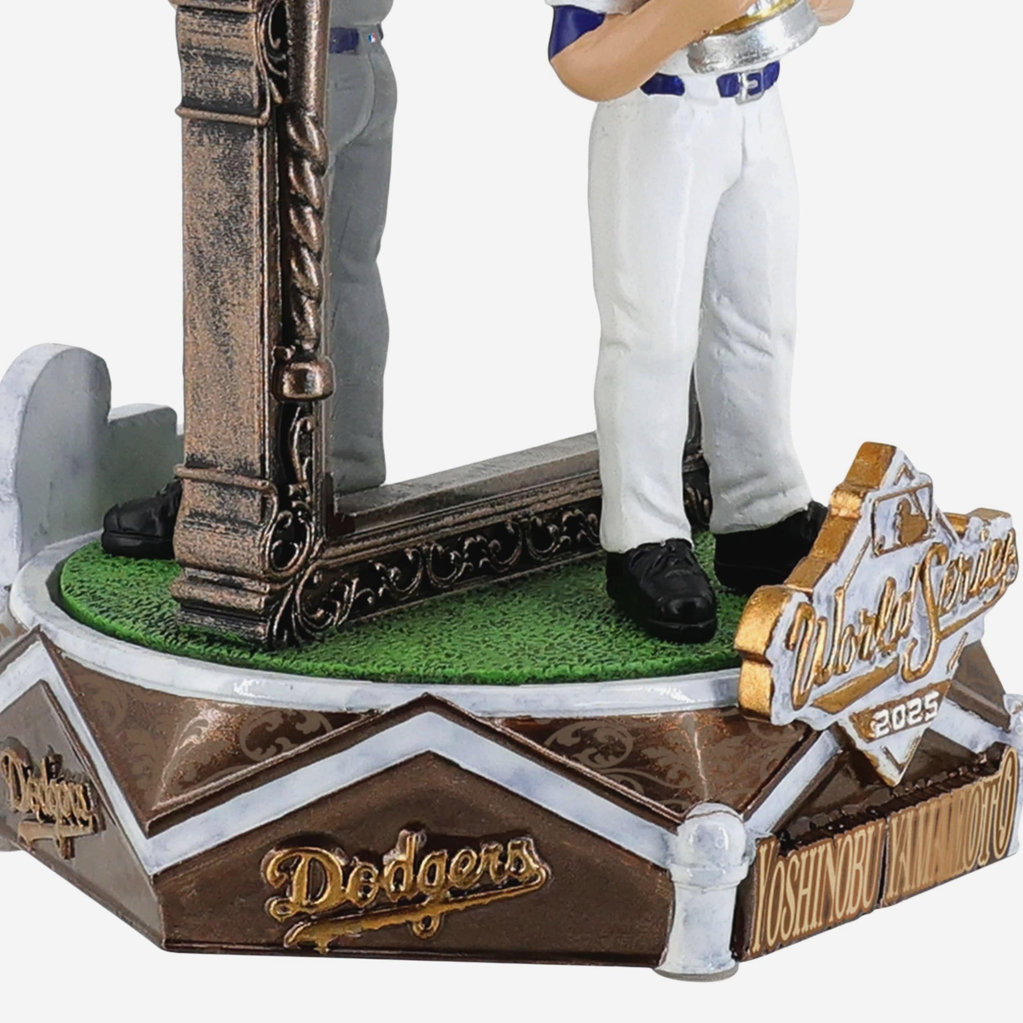 - Portrays two figures of Yoshinobu Yamamoto standing tall in his home and away uniform, proudly holding the World Series trophy for the ultimate championship flex